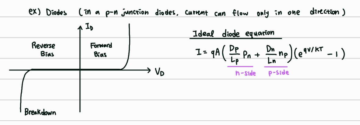 그리고 그 옆은 이상적인 다이오드의 계산에서 사용되는 공식이다. 이 공식은 다이오드에 흐르는 전류를 계산 할 수 있게 해 준다.